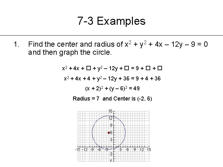 (2, 12) (2, 8) (2, 6) (2, 4)Graph the circle with equation x 2 y 2 4x 10y 13 = 0 Students also viewed these Mathematics questions Find the centerradius form of the equation for each circle x2 4x y2 6y = − 4 Now, complete the square for each part by adding constants Remember that a constant added on the left side should also be added on the right to keep the equation balanced (x2 4x 4) (y2 6y 9) = −4 4 9 This simplifies to be (x 2)2 (y 3)2 = 9 Since the standard equation of a circle with a vertex (h,k) and
